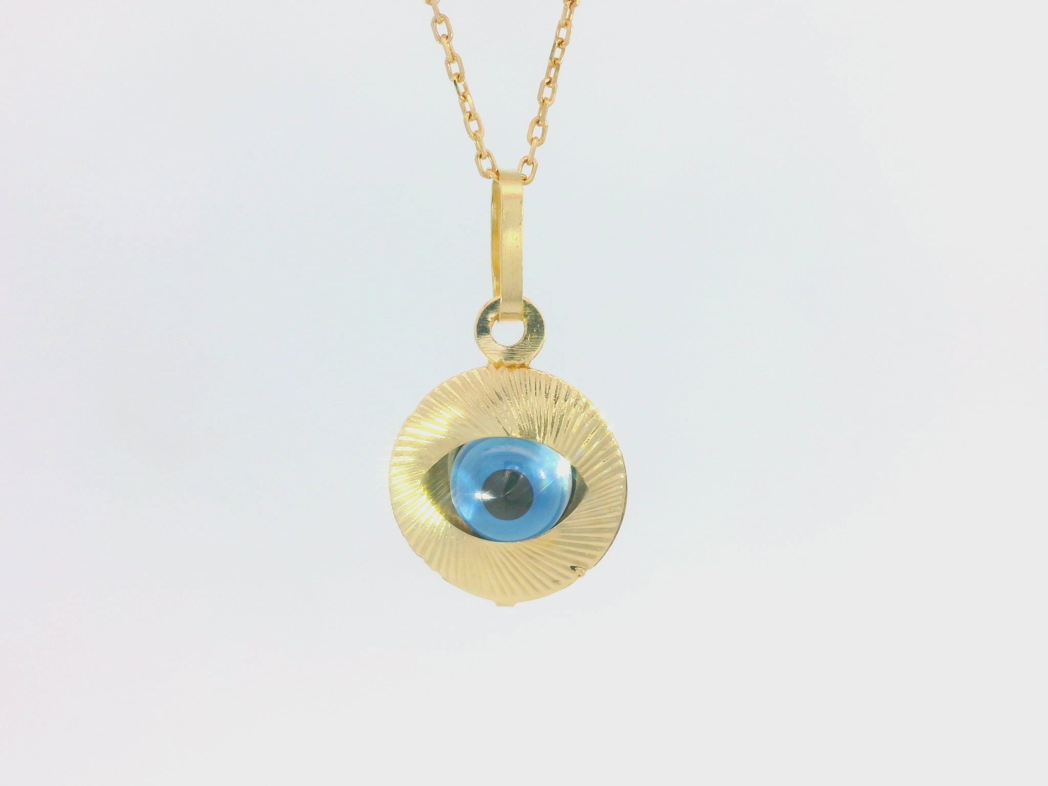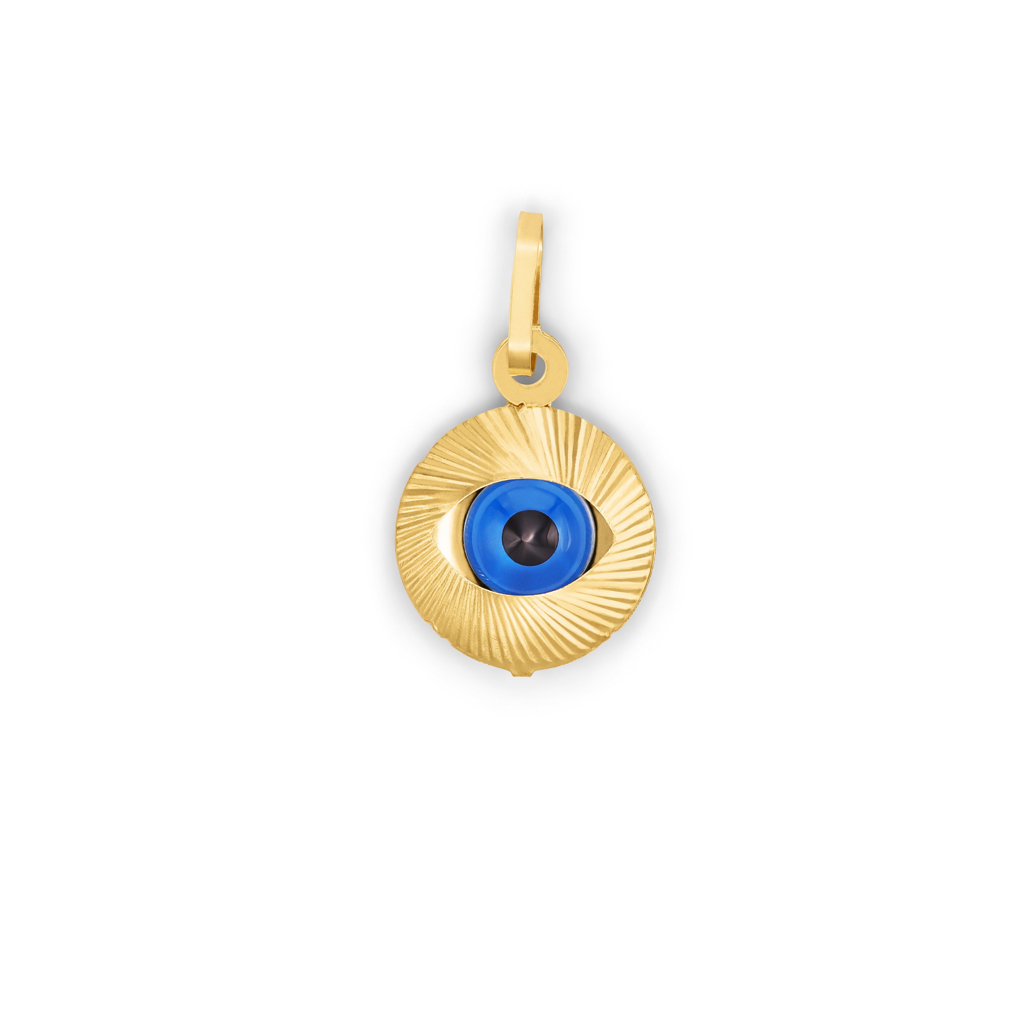 The pendant is designed in a round shape, with the Evil Eye symbol at its center